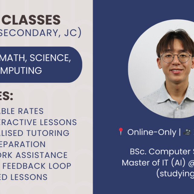 Hi! 👋 I’m an experienced tutor offering fun, interactive, and effective online tutoring for Primary and Secondary School students specially tailored to the PSLE and O-Levels curriculum.
